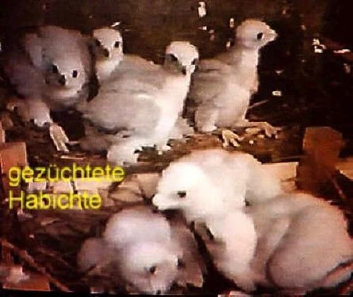 Unsere Beizhabichte hatten ja schon immer Eier an der Flugdrahtanlage gelegt. Die Notwendigkeit der Zucht mit dem Habicht war bei uns jahrelang nicht im Vordergrund gestanden, es gab keine Beschaffungsprobleme. Zwar stellten wir schon mal ab und zu Paare zusammen, die aber zufälligerweise zusammenkamen und wieder auseinander gerissen wurden, sodass gar keine Zeit für eine Paarbildung gegeben wurde. Die Freisinger Gruppe unter Adi Schreyer trieb seit einigen Jahren die Habichtszucht in Bayern zuerst mit künstlicher Besamung voran. Die künstliche Besamung musste zwangsläufig angewandt werden, da auf der einen Seite balzende, geprägte Weibchen, auf der anderen Seite zuwenig natürliche Zuchtpaare vorhanden waren. Die zwangsweise Entnahme des Samens beim Habichtsterzel führte einfach nicht zum gewünschten Erfolg. Ich konnte mich aus der Tatsache heraus, da ich mehr oder weniger allein die Sperberzucht durchführte und dadurch eine Ausweitung auf Habichte zeitlich nicht verkraftbar war, momentan dieser Aufgabe nicht stellen. Erst auf Drängen von Adi Schreyer und auch der mir einleuchtenden Tatsache, dass wir Falkner von der Abhängigkeit der Aushorstungs- und Fanggenehmigungen wegkommen müssen, die ja jederzeit gesetzlich gestrichen werden könnten, beschloss ich nach reiflicher Überlegung, ab 1991 mich intensiv mit diesem Thema zu beschäftigen. So gelang mir, immer wieder mit Unterbrechungen, bis heute eine kleinere Zahl Habichte zu züchten. Leider bleibt wie bei anderen Züchtern auch hier die Regelmäßigkeit aus, selbst mit erfolgreichen Paaren eines Jahres ist der Zuchterfolg auch nächstes Jahr nicht garantiert. Leider musste ich aber ab 2004 aus persönlichen Gründen die Zahl der Zuchthabichte reduzieren, so dass momentan leider kein Paar zur Verfügung steht.